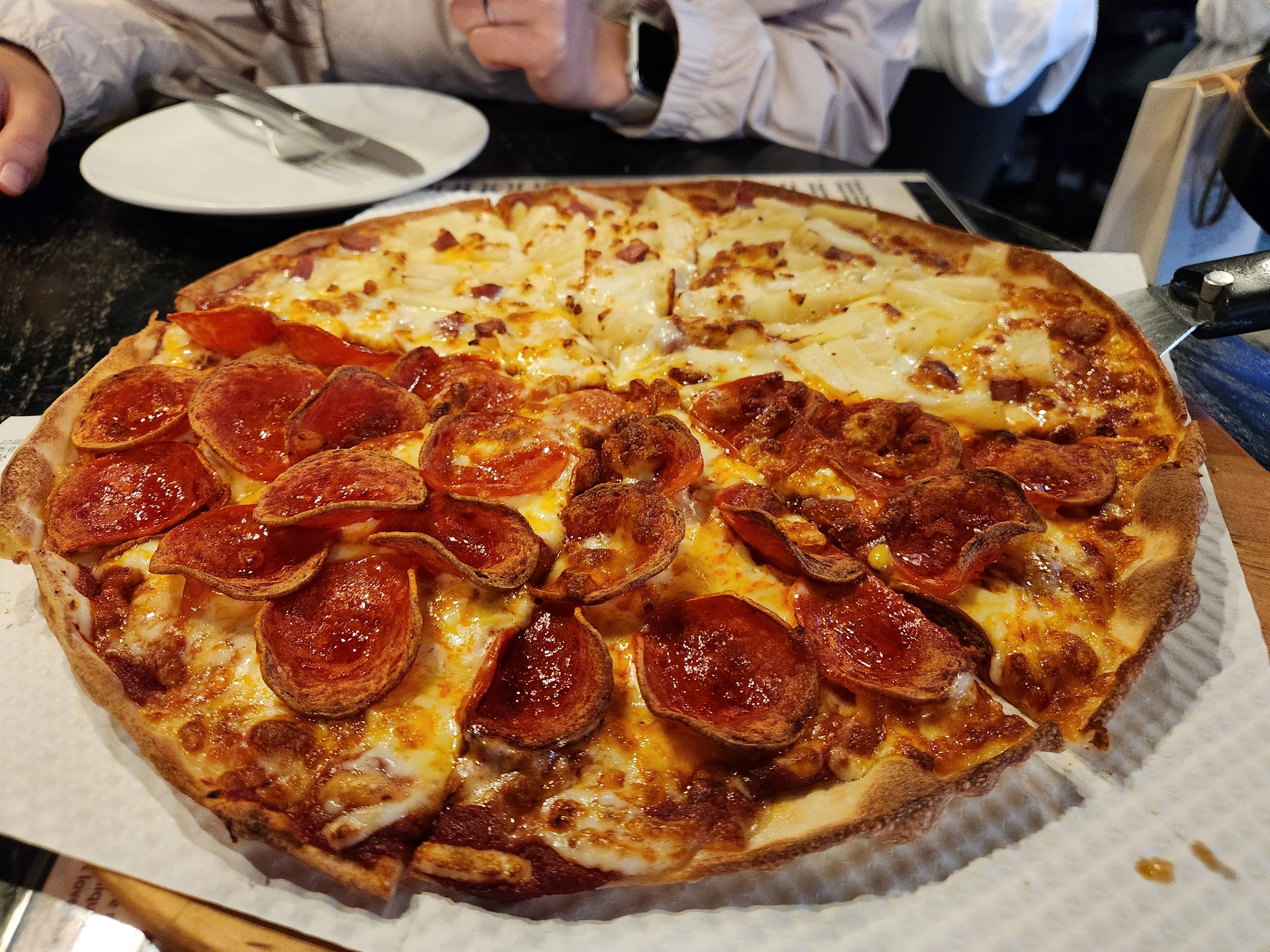Bonnie's Pizza Pub is a pizza pub in Itaewon, Yongsan-gu, Seoul, operated by foreign owners with a kiosk-based English ordering system that creates a distinctly international atmosphere. Korean communication with the staff is smooth, so the language barrier poses no real difficulty for domestic visitors. The signature combination is a half-and-half of Pepperoni and Hawaiian on a thick, chewy pan crust, where generous layers of cheese are balanced by the gentle sweetness of pineapple that spreads subtly through each bite rather than overwhelming with sugar. The Pepperoni delivers a flavor profile that clearly surpasses franchise-level pizza, while the Hawaiian redefines what the often-dismissed topping combination can achieve. The Rotorua Cheese pizza is loaded with so much cheese that the dough sometimes struggles to support the weight when lifted, and the Deviant pizza brings together meat, onion, tomato, and mushrooms for a rich, internationally-inflected flavor. The Spicy Chicken pizza adds a moderate kick that cuts through the richness effectively. Craft beers including Hazy IPA and Pale Ale complement the pizza naturally, and the overall execution has drawn praise even from American visitors who note that the local flavor is authentically captured. The french fries tend toward the salty side, and the self-serve jalapenos offered in place of pickles have a soft texture that divides opinion. The menu lacks photos, making advance research helpful before visiting, and the tight table spacing creates a lively, noisy environment during busy hours. Terrace seating expands the total capacity considerably, and depending on the time of visit, waits may occur.