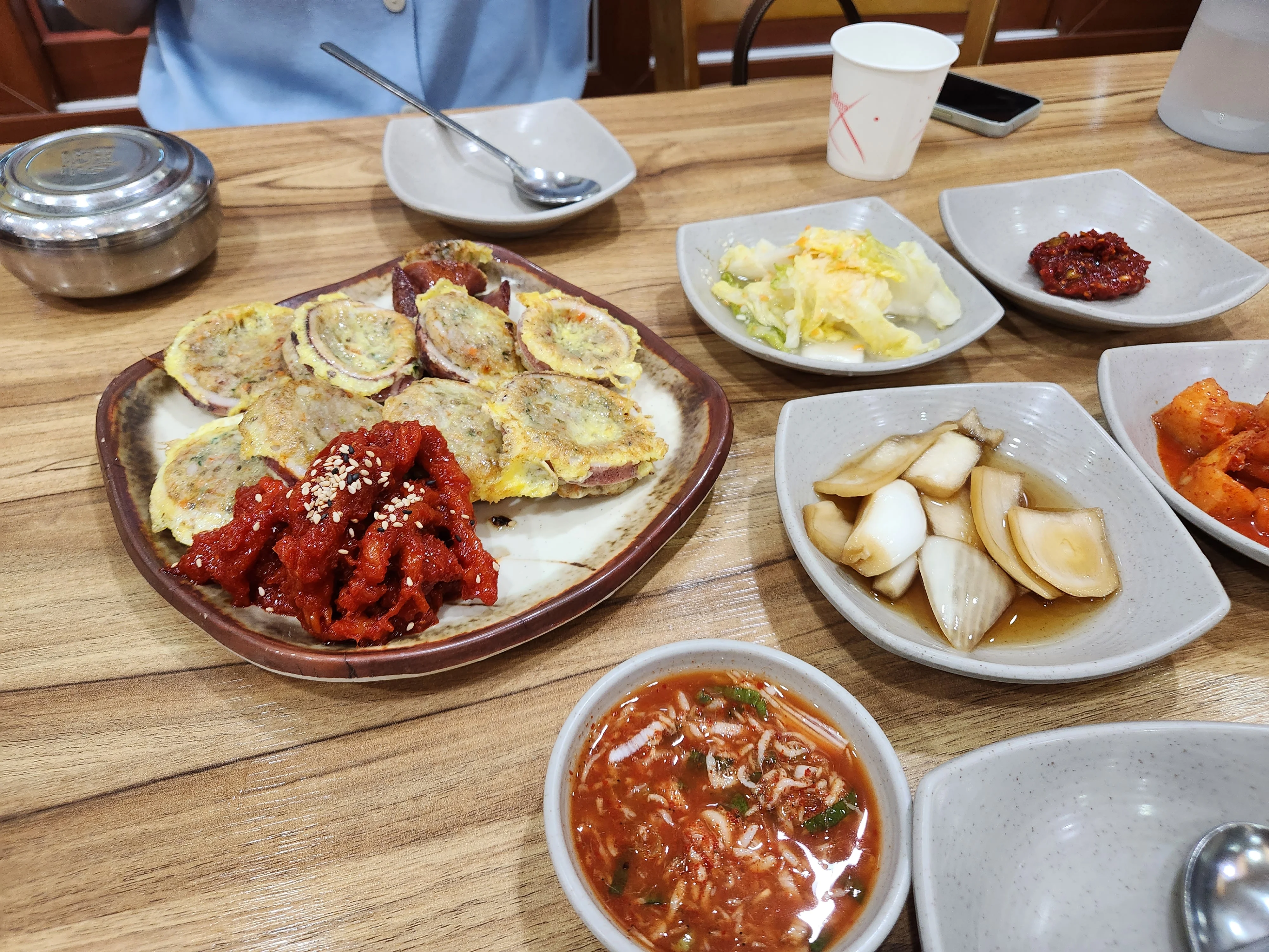 Dancheon Sikdang, located in Cheongho-dong, Sokcho, Gangwon Province, is a local restaurant celebrated for its abai sundae-guk (North Korean-style sausage soup) and squid sundae. The abai sundae-guk is distinguished by a moderately spicy broth with an intriguing depth that sets it apart from ordinary sundae soup, earning frequent praise as a hangover remedy. The broth does carry a noticeable oiliness, however, which may divide those who prefer a leaner style. The squid sundae stands out for its uniquely chewy texture as a specialty particular to this establishment, and the abai sundae itself offers a flavor distinct from standard Korean blood sausage. Among the side dishes, the seasoned pollock salad (myeongtae-hoe-muchim) is exceptionally savory — compelling enough to prompt an extra bowl of rice — and a complimentary taste of fermented skate (gajami sikhae) provides an unexpected treat. White kimchi, salted fish, and the remaining banchan are clean and concisely arranged, producing an orderly overall dining experience. The female owner runs the operation with an energetic, gregarious personality, personally overseeing the dining floor and showing thoughtful gestures such as offering complimentary drinks to families with children. International staff members are present but Korean communication poses no significant barrier, and English service is also available. The restaurant spans two floors, and while weekend lunches generate lengthy queues, the fast turnover reduces actual wait times quickly. Around 6 PM on Sundays, the restaurant is notably quiet — a recommended window for those wishing to avoid lines.