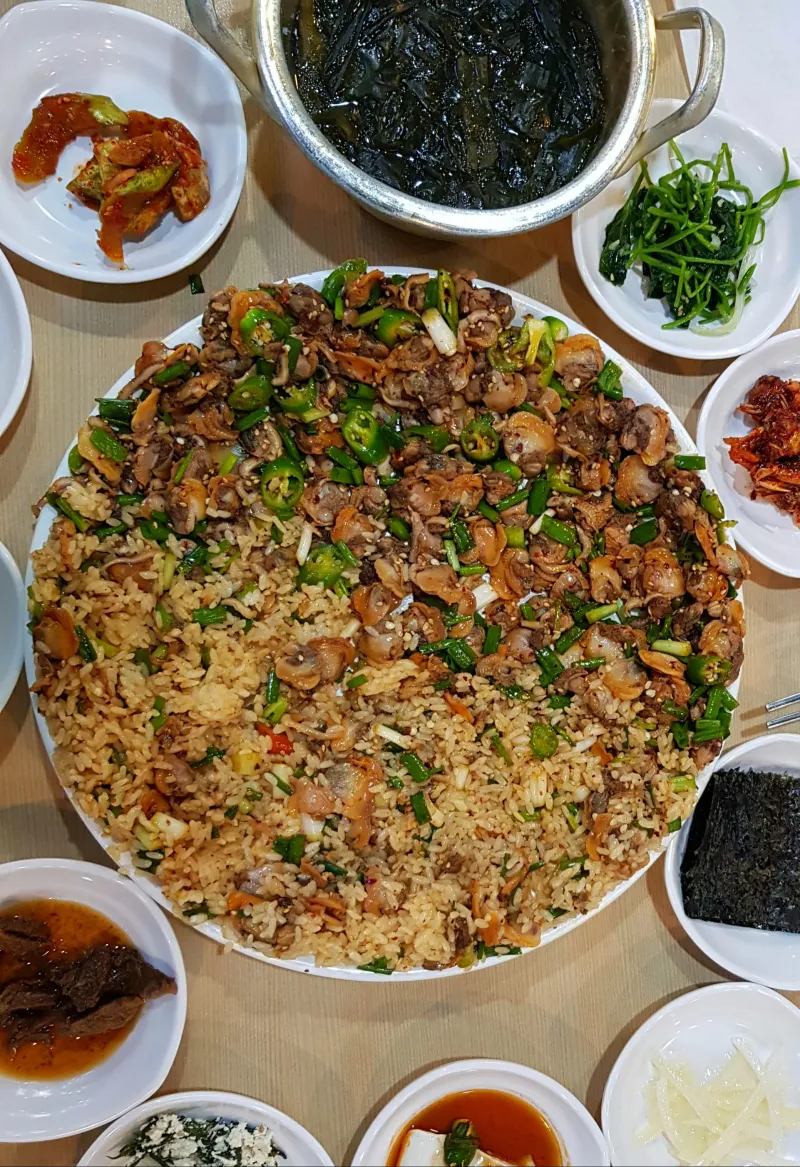 Eomjine Pojangmacha is a seafood restaurant in Gangneung, Gangwon Province, nationally renowned for its cockle bibimbap and beef tartare. The signature cockle bibimbap arrives with a mountain of seasoned cockles—half mixed with rice and the other half served as cockle muchim alone. Perilla oil (or sesame oil) provides a dominant nutty aroma, while cheongyang chili peppers add a sweet-spicy kick that defines the dish. Regulars eat the pre-mixed rice portion first, then order an additional bowl of plain rice to mix with the remaining cockle muchim for a second round. Wrapping bites in the provided sheets of gim (dried seaweed) elevates the flavor further. Those sensitive to heat may request the kitchen omit the cheongyang peppers when ordering. The beef tartare served alongside is exceptionally fresh; dipping it in the salt-sesame oil sauce and pairing it with thinly sliced pear yields a clean, elegant taste. Over ten side dishes are seasoned with precision, each encouraging another spoonful of rice, and the accompanying seaweed soup is enriched with beef for added depth. The main branch is nearly always full during meal hours, but rapid table turnover keeps waits manageable. A well-equipped waiting area on the second floor of the main building makes the queue comfortable. When the main hall is at capacity, staff direct guests to a second branch just thirty seconds away on foot, serving an identical menu. A dedicated parking lot is located roughly fifty meters from the main branch. The restaurant is widely considered an essential stop on any Gangneung trip, and for two diners the most efficient order is one cockle bibimbap, one beef tartare, and an extra bowl of rice.