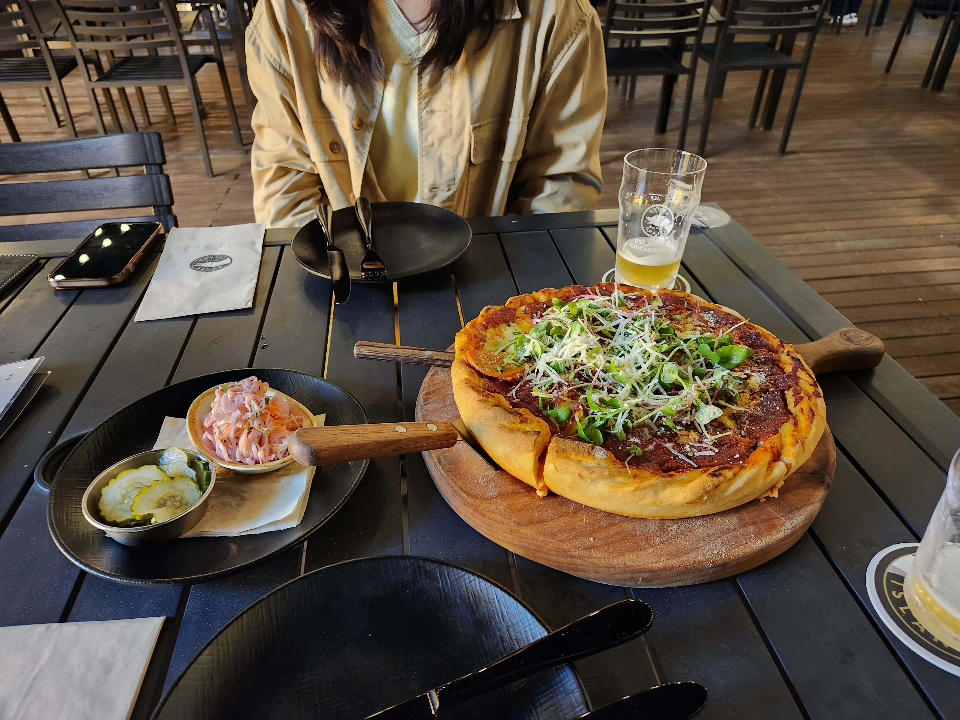 Goose Island Brewhouse on Yeoksam-ro in Gangnam-gu, Seoul, is a large-scale craft beer pub whose floor-to-ceiling windows and high ceilings create an immediately striking sense of openness. The tap list spans lagers, IPAs, and ales, with the house lager drawing particular praise for its clean, crisp finish. The food menu is built to complement the beer program, and the BBQ platter stands out with lamb that is moist and free of gaminess, dressed in a sauce calibrated to avoid excessive sweetness — a strong pairing partner for the lighter beers on draft. The classic Chicago deep-dish pizza balances cheese and toppings without an overly thick crust, making it one of the few reliable options for that style in Seoul. Bar snacks including fried calamari round out the beer-friendly selections. The venue is spacious enough to accommodate private events, and the warm lighting paired with the eclectic interior makes it equally suitable for corporate gatherings, holiday parties, and casual dates. Takeout of craft beer is also available. Noise levels climb significantly during busy periods, so the space suits lively social occasions better than settings where quiet conversation is important. Some map applications occasionally list the location as permanently closed, but the restaurant continues to operate normally.