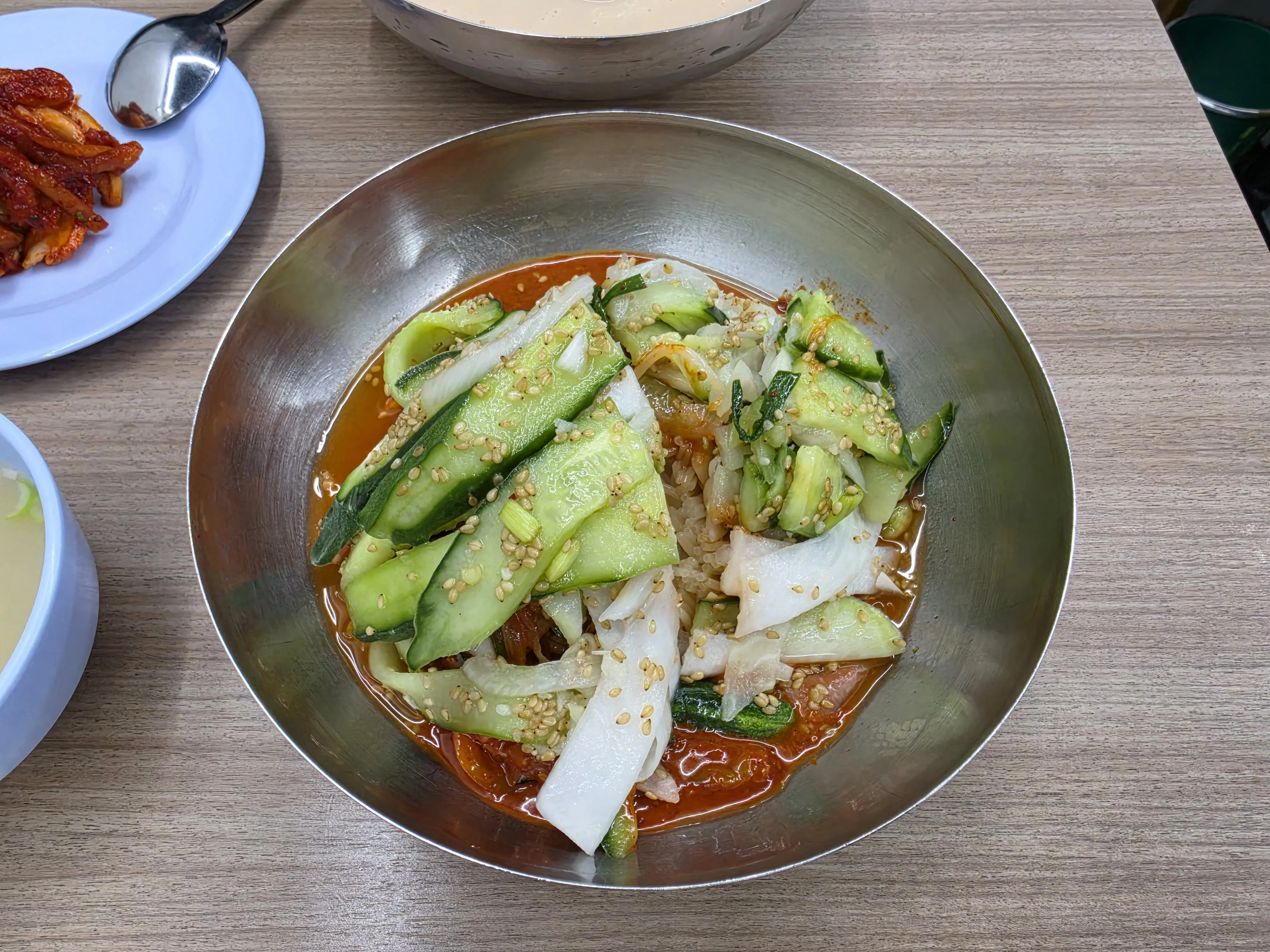 Jinjujip is a legendary noodle spot in Yeouido, famous for its exceptionally thick and creamy Kongguksu (cold soy milk noodle soup). The soy broth is deeply nutty and perfectly seasoned right out of the kitchen, eliminating the need to add any extra salt or sugar. The true secret weapon here is the sweet and crunchy radish kimchi served on the side; eating a mouthful of the noodles with this kimchi creates a brilliant harmony. I strongly suggest ordering the sweet and spicy Bibimguksu alongside a plate of their boiled pork dumplings. The thick, chewy dumpling wrappers pair flawlessly with the spicy noodles. Lines stretch to 100 people before they even open at 10 AM, but the massive dining room means the queue moves remarkably fast.