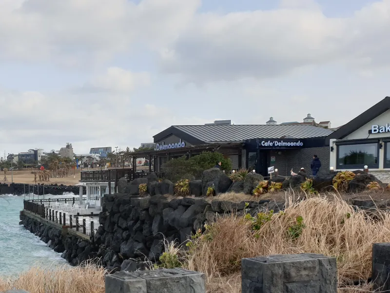Cafe Delmoondo Hamdeok is a large-scale ocean-view cafe positioned directly in front of Hamdeok Beach in Jocheon-eup, Jeju, commanding unobstructed views of the emerald-colored water. The operation divides into a takeout-only section and a dine-in section, with the interior comprising a spacious main hall, a basement level, and a separate annex building, together providing substantial seating capacity. The annex features an analog-inspired interior aesthetic. The Gujwa Carrot and Mayo bread and the Udo Peanut bread serve as the cafe's signature bakery items, utilizing local Jeju ingredients in charming shapes with flavors that satisfy. The Hallabong-shaped Labong Sugar bread photographs well but contains primarily fresh cream, making it rich to the point of heaviness. The Jeju-themed breads carry novelty value, though some assessments suggest their flavor falls short of their visual appeal. The coffee leans toward acidity, and decaffeinated options are available. Gelato is also sold. Beverage and bakery pricing runs on the expensive side throughout the menu. The fundamental draw of this cafe lies in its commanding beachfront position. The emerald ocean and expansive sightlines create an environment suited for extended stays, though the continuous flow of tourists makes a quiet, leisurely atmosphere difficult to achieve. Order queues frequently grow lengthy, so the efficient approach involves one member of the group securing a table while others wait in line. During winter months, the first floor tends toward chilliness, making the warmer second floor a more comfortable choice. On days with minimal wind, the outdoor terrace brings the ocean experience closer. The parking area is relatively spacious. The location directly beside Hamdeok Beach makes it convenient as a resting spot for non-swimming companions or as a pre- and post-swim destination.
