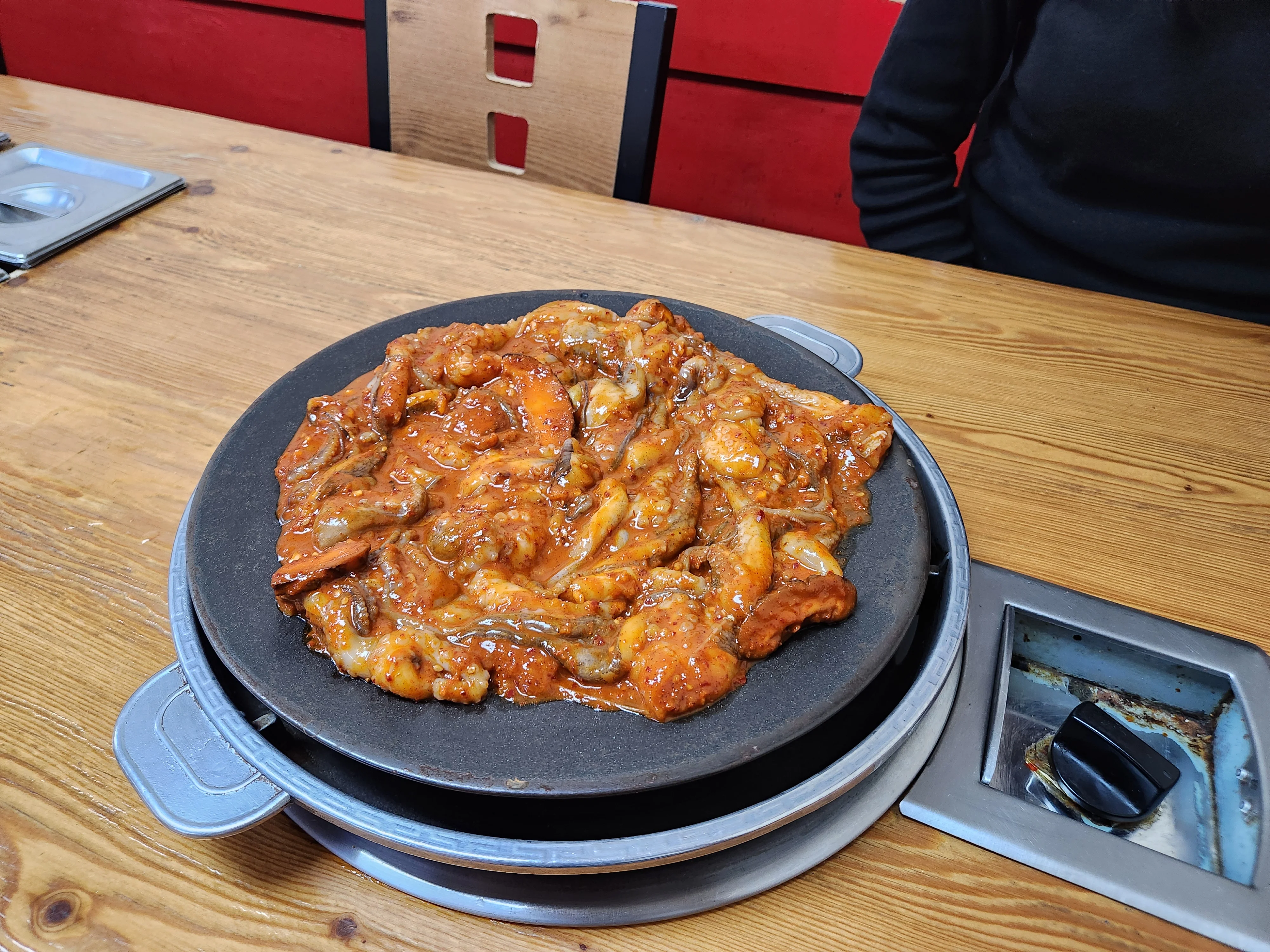 Najeongsun Halmae Jjukkumi is the original jjukkumi restaurant in Seoul's Yongdu-dong octopus alley, Dongdaemun-gu, and consistently draws the largest crowds among the many jjukkumi shops lining the street. The defining quality of this kitchen is how the baby octopus behaves under prolonged cooking: where most jjukkumi turns rubbery with extended heat, here the pieces remain tender and chewy even as the sauce reduces and concentrates, creating an unusually harmonious meld of protein and seasoning. The spice level is substantial but falls into the category of addictive heat rather than punishing burn — the kind that keeps chopsticks moving rather than reaching for water. Adding a generous pile of raw garlic cloves and letting them cook through amplifies both the heat and the savory depth to their maximum. Wrapping the octopus in perilla leaves with glass noodles softens the intensity, and palate-cleansing bites of pickled radish and carrot between rounds keep the experience manageable. The ordering system is automatic: seating triggers a per-person serving without a separate order step. The meal's conclusion is bokkeumbap — fried rice prepared tableside by staff who gauge proportions by eye, tossing it in the residual sauce until every grain absorbs the concentrated flavor. An alternative finish involves moistening the rice with the remaining broth and topping it with octopus pieces. The doenjang-jjigae that accompanies the fried rice order is mild and serves as an effective counterbalance to the spice. A small gesture of hospitality awaits at checkout, where the grandmother hands out yogurt drinks. The physical environment carries some drawbacks. Table spacing is extremely tight — descriptions of feeling packed in are not exaggerations — and overall cleanliness does not reach pristine standards. Entry requires the entire party to be present, so coordinating arrival times matters. Driving is discouraged because parking in the area is nearly impossible; public transit is the practical choice. Takeout portions are doubled in quantity, but reheating at home lacks the wok-fired char that defines the in-restaurant experience. Prices have climbed noticeably over the years, yet the flavor has remained consistent enough to keep regulars returning on a cyclical basis.