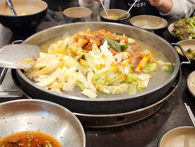 Tongnamujip Dakgalbi is the original iron-plate dakgalbi restaurant in Sinbuk-eup, Chuncheon, Gangwon Province, operating for approximately fifty years as one of the most representative establishments in Chuncheon's dakgalbi tradition. Located on a spacious property near Soyang River Dam, the restaurant employs a large staff and maintains a systematized operation that drives efficient table turnover. The dakgalbi sauce follows a recipe preserved for five decades, notable for being neither harsh nor salty while allowing the tender texture of the chicken to carry the dish. Some diners detect a faint curry-like spice note in the finish. Dak-naejang (chicken intestines) are fresh and chewy, and mixing them into the dakgalbi during cooking is a strongly recommended combination. Chicken neck meat is also available as a separate order, enabling a multi-cut tasting experience. The gamjachae-jeon (shredded potato pancake) delivers exceptional crispness from its thinly cut and fried preparation, though the oil content runs generous. The makguksu with perilla oil produces an intensely nutty aroma that complements dakgalbi remarkably well, and the house-made donkatsu offers a thick, crispy option that works as a children's menu favorite. Fresh ssam vegetables are available from a self-service bar in unlimited quantities, and the iron-plate fried rice prepared at the end of the meal is considered an essential finishing course, though some diners note it leans slightly salty. Arriving fifteen minutes before opening still results in wait numbers in the thirties, though the massive dining room ensures actual entry proceeds relatively quickly. The parking lot is generous but experiences its own queues on weekends. The smell of grilled chicken embeds deeply into clothing during the meal, so wearing easily washable attire is a practical recommendation.