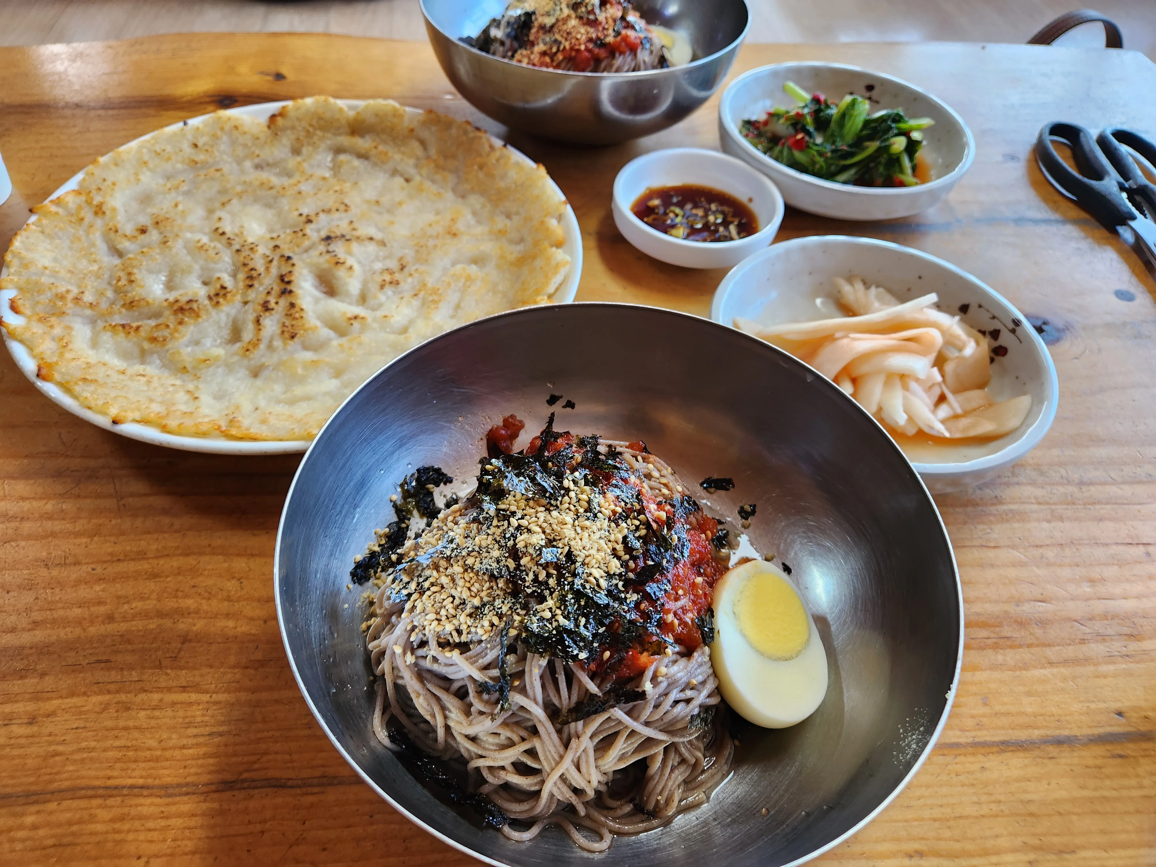 Yeonggwangjeong Memil Guksu Bonjeom sits along a quiet rural road in Ganghyeon-myeon, Yangyang-gun, Gangwon-do, and has become an essential stop on any Yangyang trip since its appearance on the television show Wednesday Food Talk. The noodles, made with a high proportion of buckwheat, have a characteristically rough texture that breaks apart in the mouth, and this rustic quality is precisely what defines top-tier buckwheat noodles. The onion-based seasoning is mild and understated, and pouring in the dongchimi broth transforms the bowl as the slightly icy, clean-tasting radish water kimchi liquid mingles with the noodles to create a soothing, refreshing combination. Because the flavor shifts noticeably before and after adding the dongchimi, a two-stage approach is recommended: enjoy the noodles on their own first, then introduce the broth. Dadaegi, sugar, and other condiments are available for those who prefer bolder seasoning. The suyuk boiled pork is a highlight, cooked until the surface glistens with a complete absence of pork odor, and ordering it alongside the noodles creates an ideal pairing. The potato pancake uses nothing but potato and salt, without the zucchini or other fillers found elsewhere, allowing the natural nuttiness of the potato to come through fully. The restaurant uses a traditional shoeless seating arrangement, and the window-side seats offer a view down over a peaceful village that adds considerable charm to the meal. Doors open at 10 AM, though locals often arrive early enough to walk in without waiting, and service continues without a break until 7 PM. The parking lot is spacious and well suited for car access, but the restroom is located across the road, requiring careful crossing. For travelers exploring the Sokcho and Yangyang area, this restaurant deserves a prominent place on the dining itinerary.