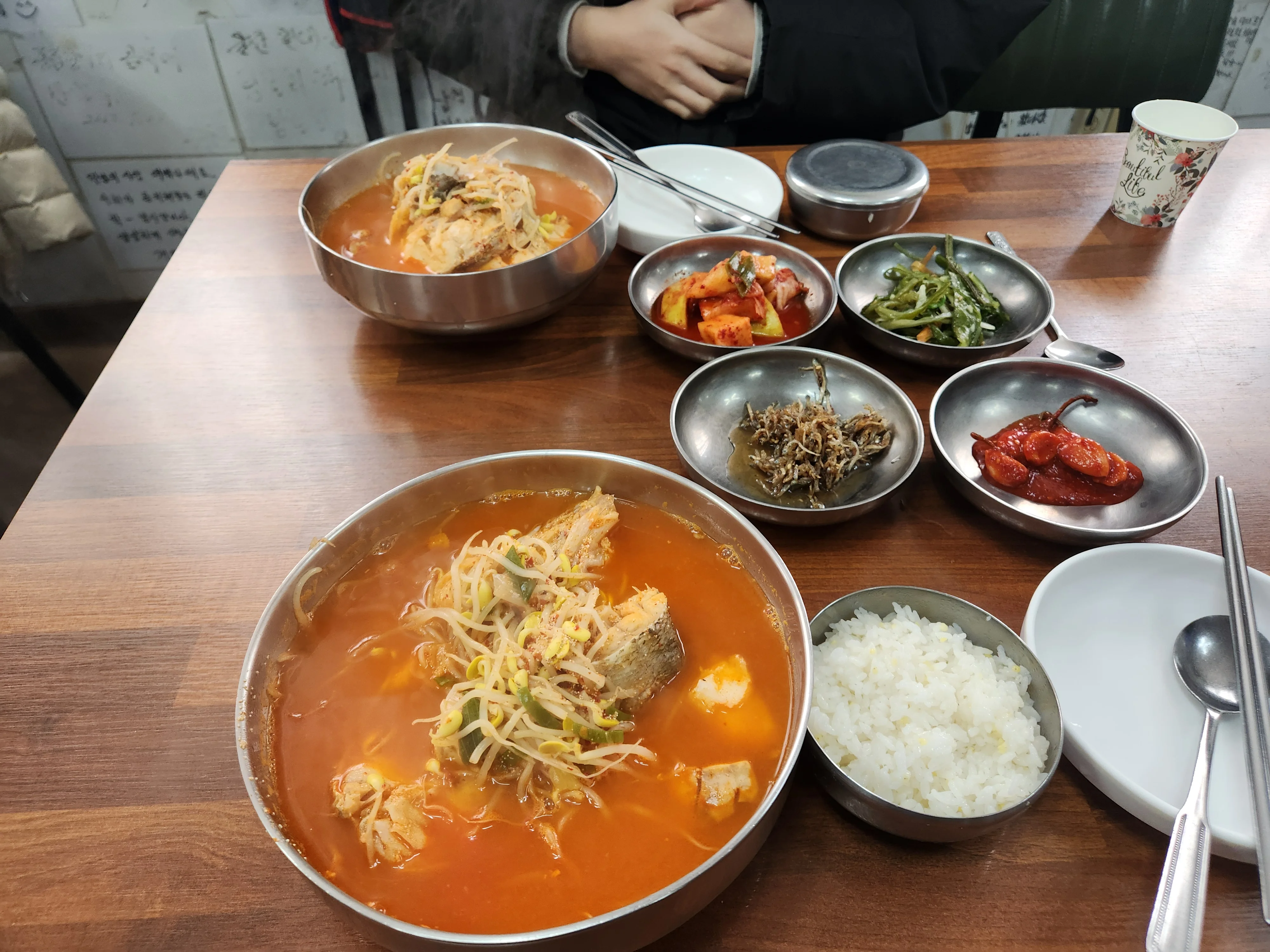 江原道三陟市の三陟港近くに位置するマンナムィシクタンは、ゴムチグク(オコゼスープ)の専門店で、三陟地域の郷土料理であるゴムチ解醬グクを代表する食堂です。ゴムチは標準語でコムチと呼ばれ東海岸地域で獲れる魚で、身が柔らかいためかつては捨てられていましたが、現在ではさっぱりとした淡白なスープの味わいから最高の解醬グク食材として評価されています。この店のゴムチグクは澄んだチリ方式ではなく、熟成キムチを入れてピリ辛に煮込む江原道式で、辛さの中にすっきりとした清涼感があり前日の二日酔いを解消するのに抜群の効果を発揮します。ゴムチの身は江原道式らしく大きめに切って丸ごと提供され、とろけるような独特の食感がこの料理の核心です。ただしこのとろっとした食感は好みがはっきり分かれる点で、慣れれば最高の味になりますが初めての方はテグタン(タラのスープ)を選ぶのが安全な代替策です。テグタンもすっきりと胃に優しい味わいで高い評価を得ており、内臓が入ることで香ばしさが加わります。おかずはすべて自家製で、特にエラの塩辛で漬けたカクテキの味が印象的です。食後に喉が渇かないことからMSGを使わない正直な調理法がうかがえます。女性オーナーの気前の良さとスタッフの親切なサービスもこの食堂の魅力です。量がたっぷりで、ゴムチグク1杯とテグタン1杯を3人で分けても余るほどです。年季の入った食堂ならではの素朴な雰囲気があり、壁一面に有名人のサインがぎっしりと飾られ長い歴史を物語っています。営業時間は平日午前8時、週末午前7時にオープンし午後2時30分に閉店で、オープン直後から満席になることが多いためできるだけ早い来店がおすすめです。駐車は食堂周辺100メートル以内で可能です。
